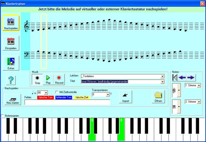 Der Klaviertrainer bringt bereits etliche Lieder und Übungen in verschiedenen Lektionen mit, welche auf der Tastatur nachgespielt werden können. Auch wenn dafür die virtuelle Klavier-Tastatur des Programmes genutzt werden kann, ist es jedoch wesentlich sinnvoller eine "echte" externe Klavier-Tastatur anzuschließen. In den Einstellungen lässt sich dafür u.a. der MIDI-Eingang festlegen.